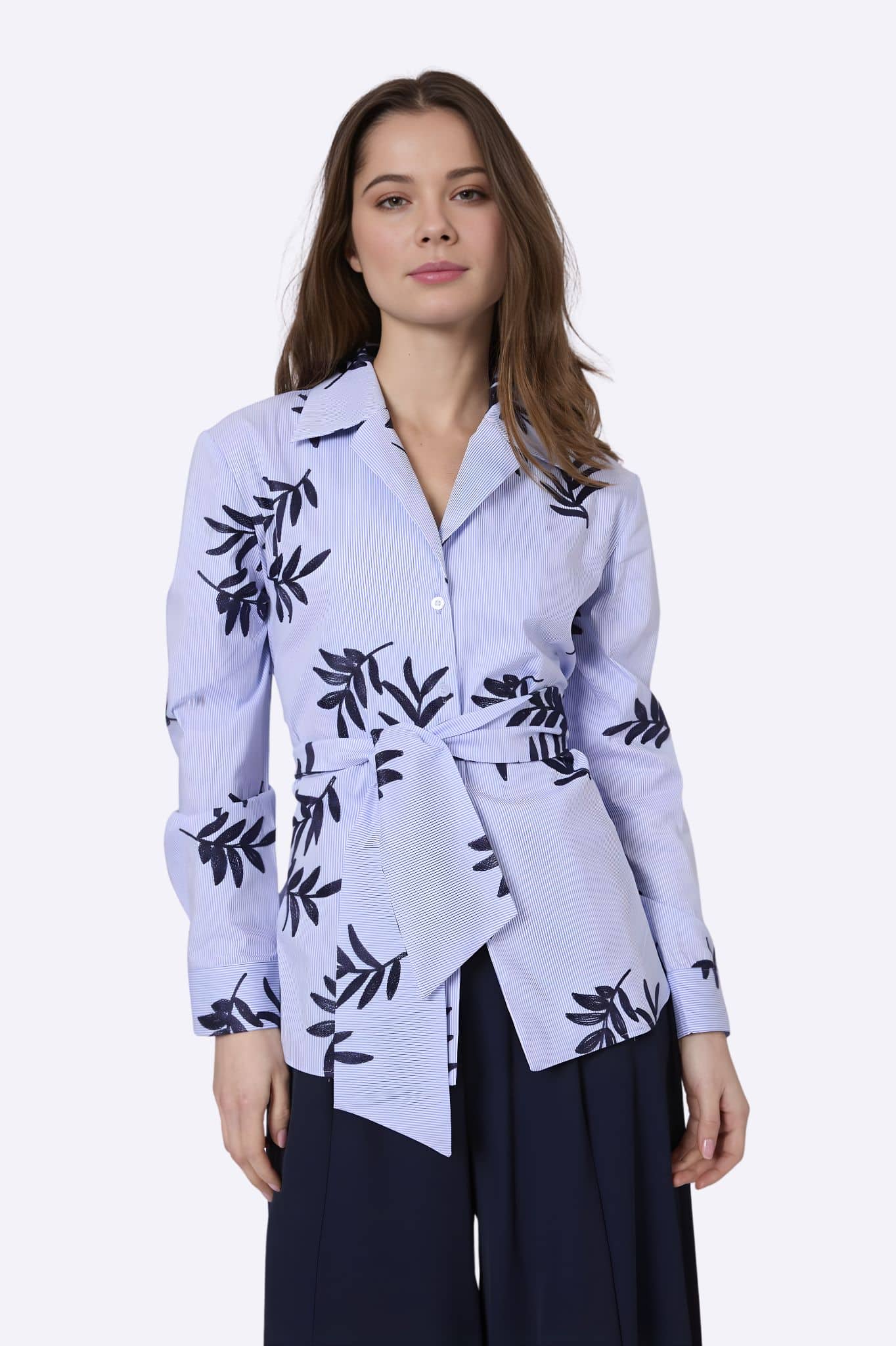 ¿Una camisa que parezca un blazer y tenga la comodidad de una blusa? La camisa de rayas Bocetto con bordado de ramas y cinturón bajo el pecho lo consigue. Estructurada, femenina y con un detalle que marca la diferencia.