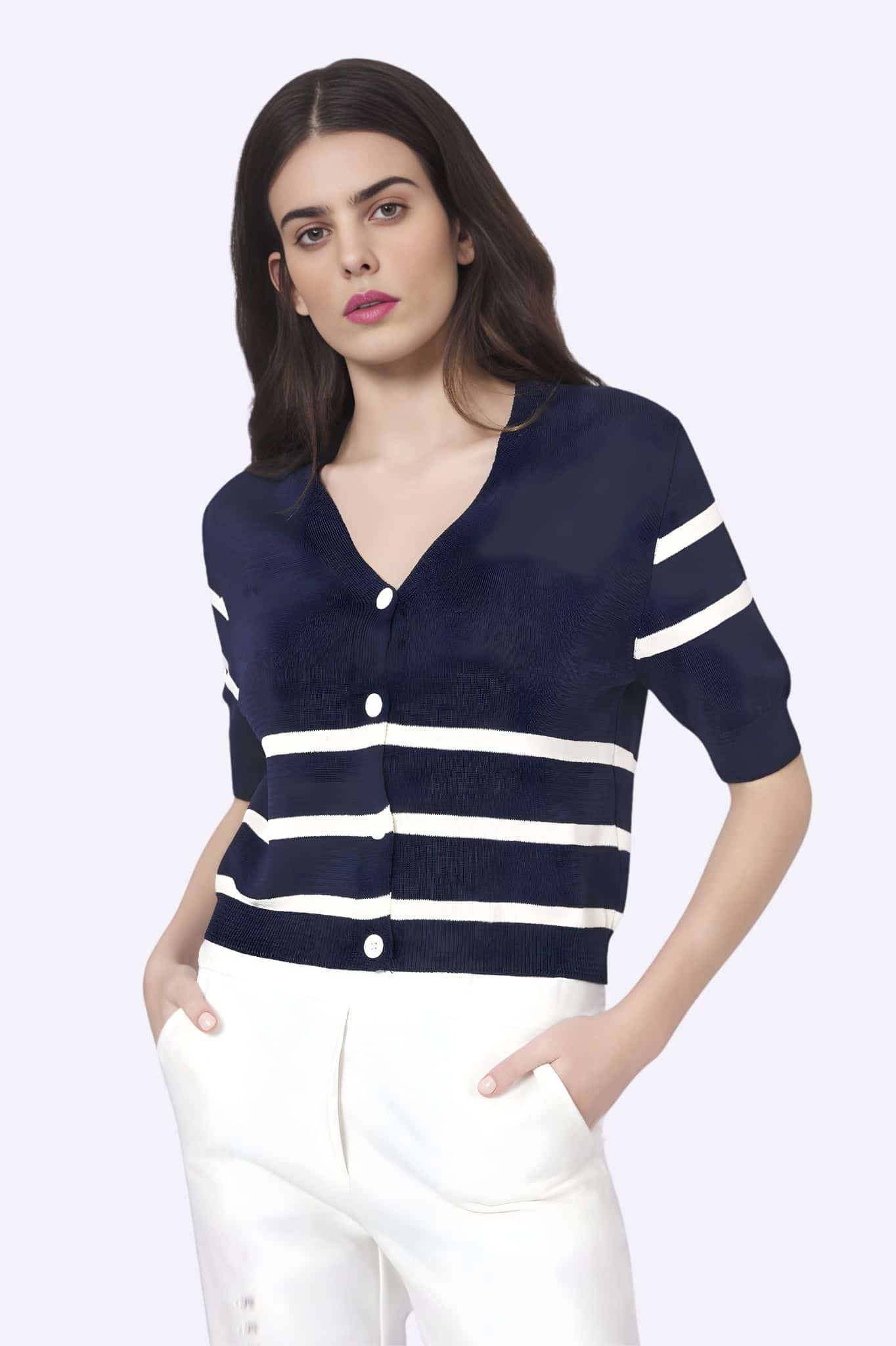 ¿Buscas esa chaqueta que funciona con todo? La chaqueta de punto Bocetto con rayas en contraste y manga 3/4 es la pieza que eleva cualquier look sin esfuerzo. Versátil, cómoda y con un detalle que se nota.